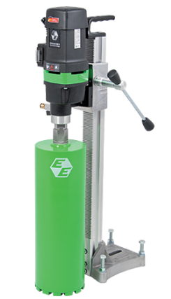 Пристрій алмазного буріння Eibenstock DB 200 складається зі свердлильної системи та стійки. Це встановлення має базовий набір найбільш зажаданих під час алмазного буріння функцій. Свердлильна установка Eibenstock DB 200 призначений для буріння армованого бетону або просто бетону (все залежить від коронки), природного та синтетичного каменю, асфальтових покриттів. Це встановлення без функції нахилу стійки, комплектується одношвидкісним мотором потужністю 2500 Вт. Оберти шпинделя установки становлять 675 об/хв на холостому процесі та 450 об/хв під навантаженням. За допомогою Eibenstock DB 201 можна здійснювати свердління отворів в цеглі, бетоні, в армованому бетоні діаметром до 202 мм. Для під'єднання коронки шпиндель Eibensock DB 201 має напівдюймову внутрішню різь (1⁄2") і зовнішню різь 1 1⁄4". Також у шпиндель із неіржавкої сталі інтегрований адаптер для подавання води з краєм, який регулює її об'єм під час свердління. Eibensock DB 201 комплектується стійкою без можливості зміни кута свердління (тільки під кутом 90°). Зубчаста планка на стійці змінна та під час зносу її можна замінити. Висота стійки 790 мм, максимальний робочий хід мотора 550 мм. Ручка, якою забезпечується мотор, у процесі свердління, може встановлюватися як справа, так і ліворуч. Мотор, яким укомплектована Eibenstock DB 201, має захисну муфту зчеплення, яка спрацьовує в момент заклинювання коронки. У такий спосіб захищається від пошкодження як мотор, так і коронка. Редуктор двигуна міститься в оливній ванні, чим забезпечується його оптимальне мастило. Крім того, щітки мотора, під час зносу, самовідключаються. Поліуретановий мережевий кабель Eibenstock DB 201 забезпечений пристроєм захисного вимкнення (PRCD), яке захистить оператора від ураження електричним струмом. Для запуску встановлення натисніть кнопку RESET на пульті вимкнення PRCD, після чого на ньому загориться індикація, що сигналізує про те, що захисна функція увімкнена і тільки після цього можна запускати встановлення. До стандартної комплектації Eibenstock DB 201 входить пластиковий бак під воду на 5 л зі швидкознімним з'єднанням на шлангу, а також комплект із 10 дюбелів і кріпильного гвинта. Вага обладнання 15,5 кг, постачається в картонній коробці.